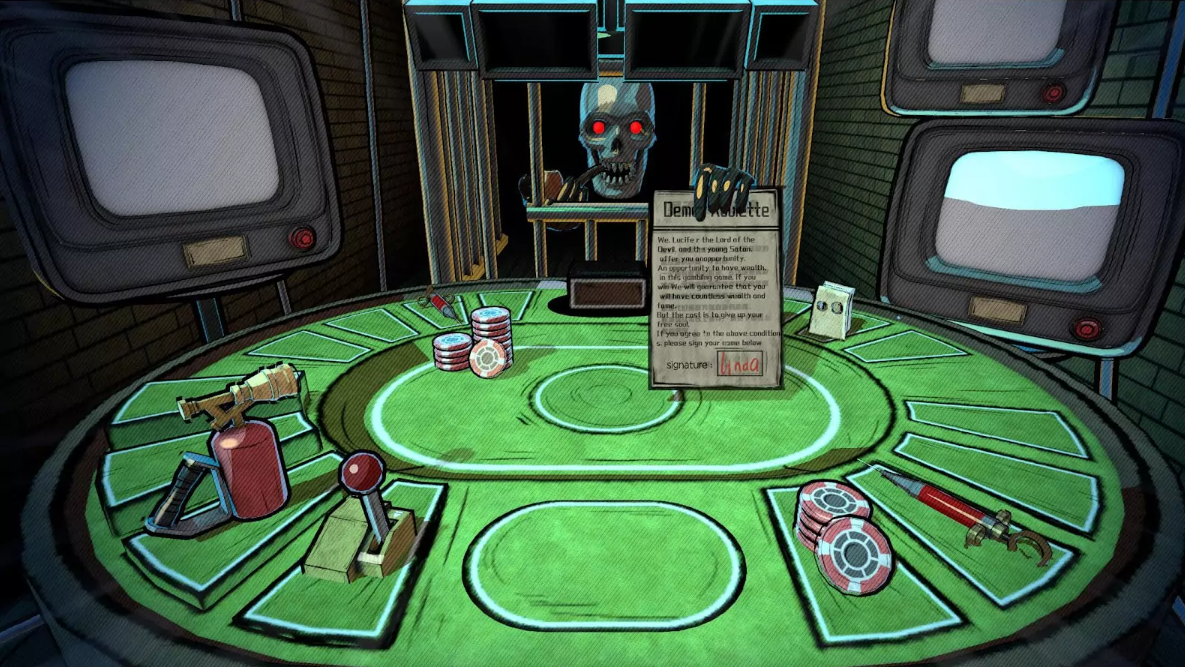 В центре игры — классическая русская рулетка, но с необычным поворотом. Вы и Дьявол поочередно стреляете из дробовика, решая, кому достанется следующий выстрел. Искусственный интеллект постоянно повышает ставки, добавляя напряжения. Вы можете выбрать, стрелять ли в себя, в противника или даже попытаться обмануть судьбу.