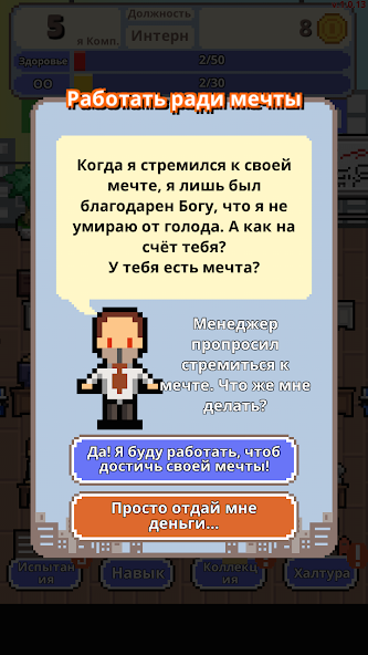 Не уволься! — это симулятор корпоративной жизни, где вы начинаете карьеру с нуля и стремитесь стать президентом компании. Ваша задача — преодолеть все трудности, от собеседований до сложных рабочих будней, и не потерять работу. Игра предлагает уникальный взгляд на офисную рутину с долей юмора и вызовов.