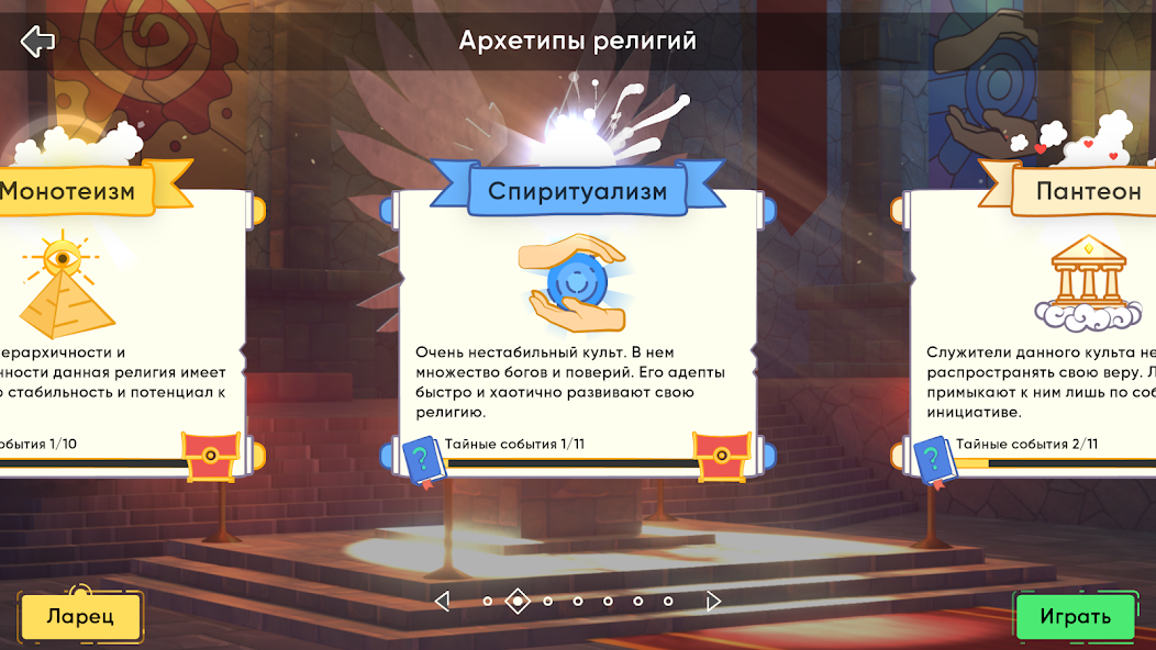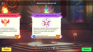 Игра предлагает множество архетипов, каждый из которых обладает уникальными способностями. Вы можете экспериментировать с различными стратегиями: от мирного просвещения до агрессивного насаждения веры. Исследуйте дерево прокачки, чтобы открыть новые аспекты и традиции.