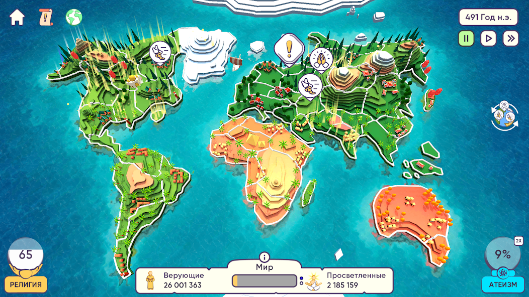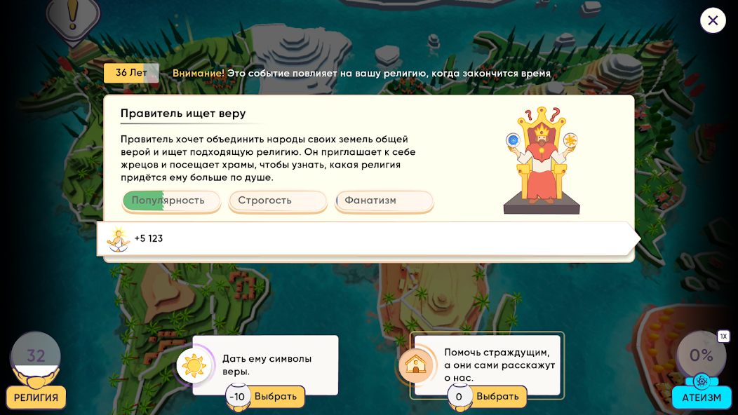 Вам предстоит развивать свою религию, выбирая аспекты, которые сделают её уникальной. Создавайте храмы, вдохновляйте людей и боритесь с атеизмом. Балансируйте между популярностью, строгостью и фанатизмом, чтобы ваша вера не только распространялась, но и оставалась устойчивой.