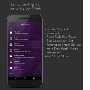 Приложение поддерживает 5-полосный эквалайзер с настройкой басов и виртуализатором, автоматическую загрузку обложек альбомов и создание пользовательских плейлистов. Вы можете настроить фон, выбрать одну из 10 тем оформления и даже синхронизировать старые плейлисты. Для удобства предусмотрена возможность управления музыкой по жанрам, альбомам и папкам.
