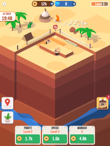 Всё начинается с одного рабочего, который медленно копает землю. Со временем вы нанимаете больше помощников, ускоряете их работу и открываете новые уровни. В процессе вы зарабатываете ресурсы, которые можно потратить на улучшения. Например: