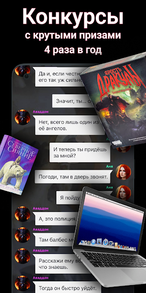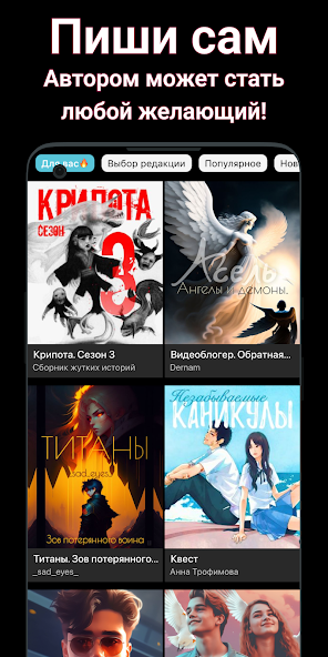 «Взахлёб» предлагает не только читать, но и создавать свои произведения. Вы можете писать рассказы, делиться ими с другими пользователями и получать обратную связь. Вдохновляйтесь любимыми жанрами, будь то ужасы, приключения или даже фанфики по популярным вселенным. Приложение поддерживает множество форматов: от текстовых новелл до аудиокниг, что делает процесс творчества ещё более увлекательным.