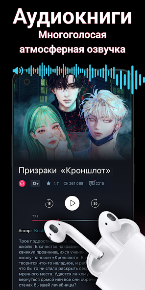 - Форматы: чат-истории, аудиокниги, манга, комиксы.