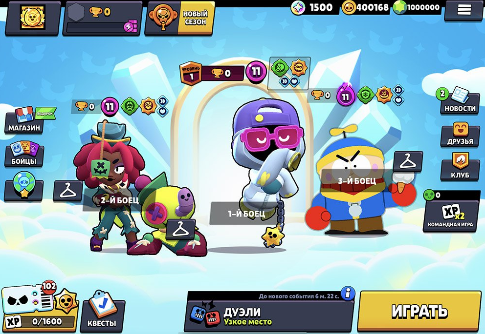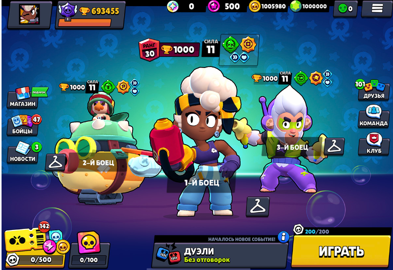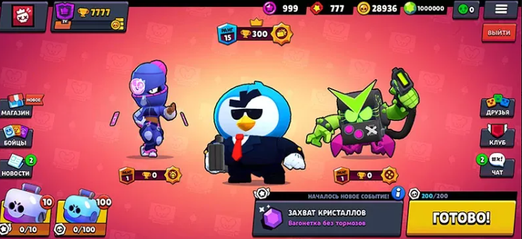 В Null's Brawl вы начинаете с миллиона монет и драгоценных камней, которые можно тратить на улучшения, скины и разблокировку бойцов. Все персонажи доступны с самого начала, а их уровни можно мгновенно повысить до максимума. Это позволяет вам сосредоточиться на стратегии и боевых навыках, не отвлекаясь на долгую прокачку.