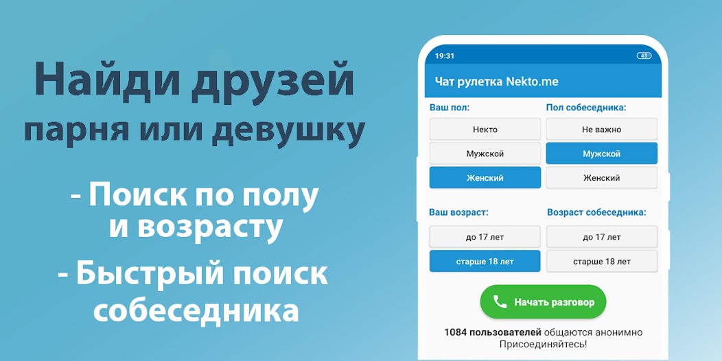 Некто Ми — это голосовой чат рулетка, где вы можете общаться с незнакомцами, не зная их внешности. Здесь всё строится на голосе, анонимности и случайности. Приложение позволяет находить собеседников по полу и возрасту, создавая уникальный опыт общения, где важны только слова и интонации.