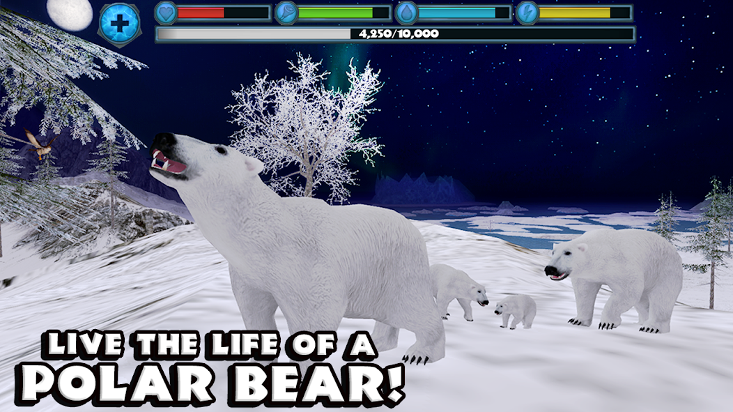 В Polar Bear Simulator вы можете найти партнёра и завести потомство. Ваши медвежата растут, становятся сильнее и помогают вам в охоте. Кроме того, игра предлагает множество миссий и достижений, которые добавляют разнообразие и позволяют быстрее развивать вашего персонажа.