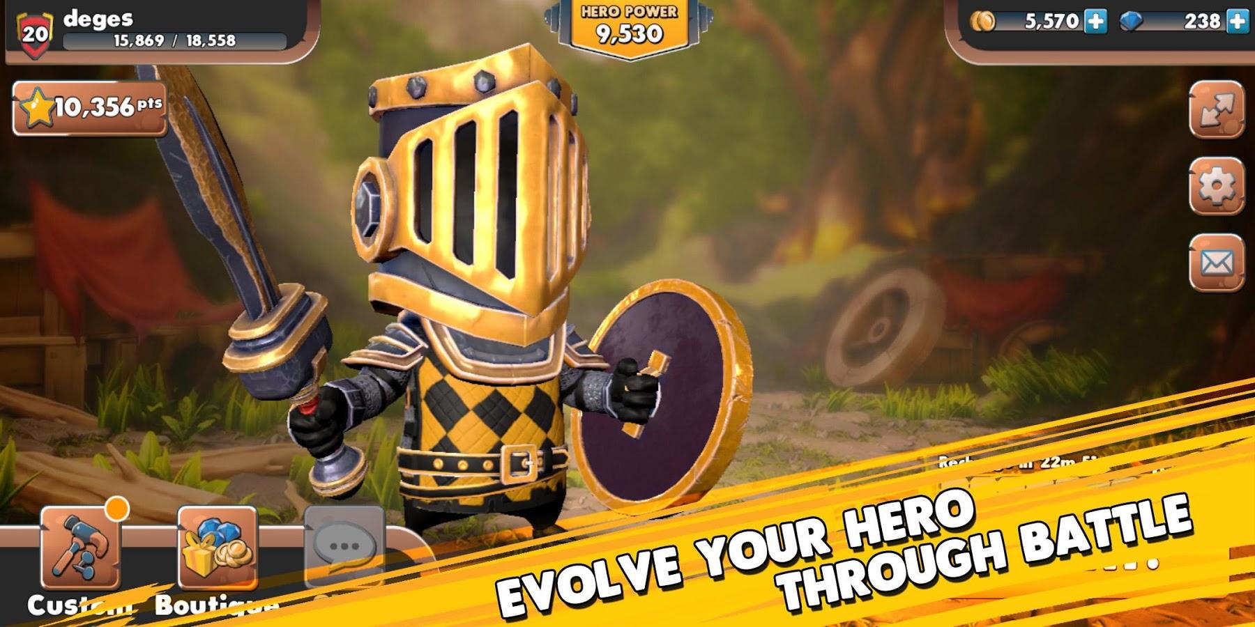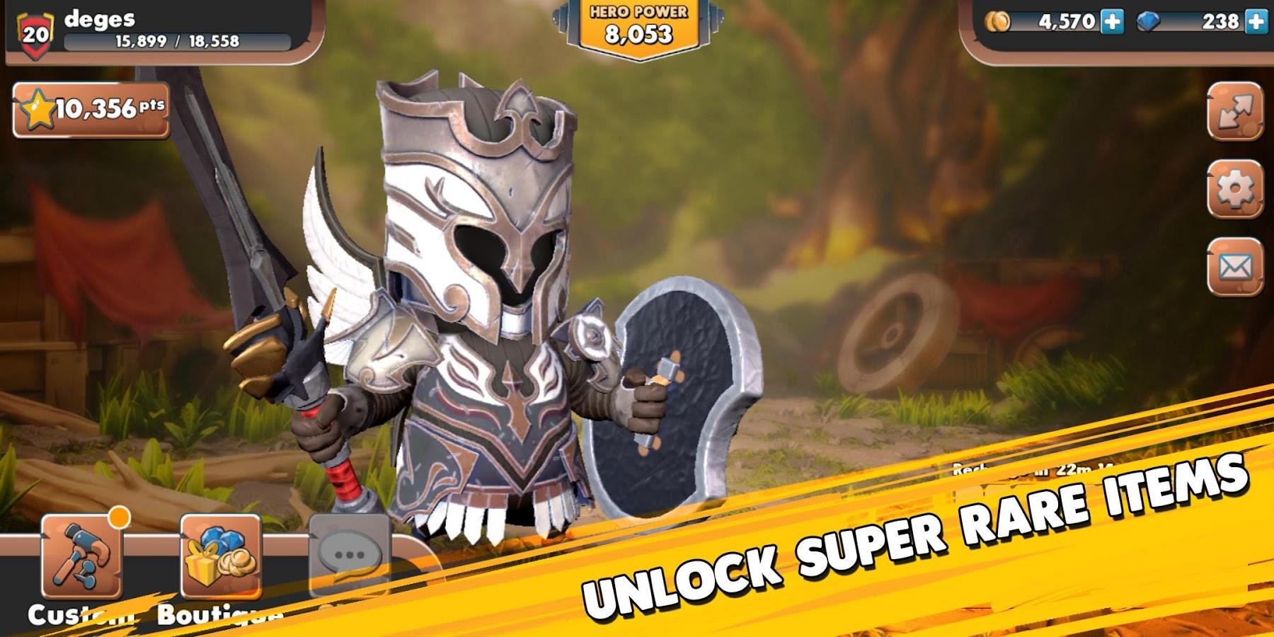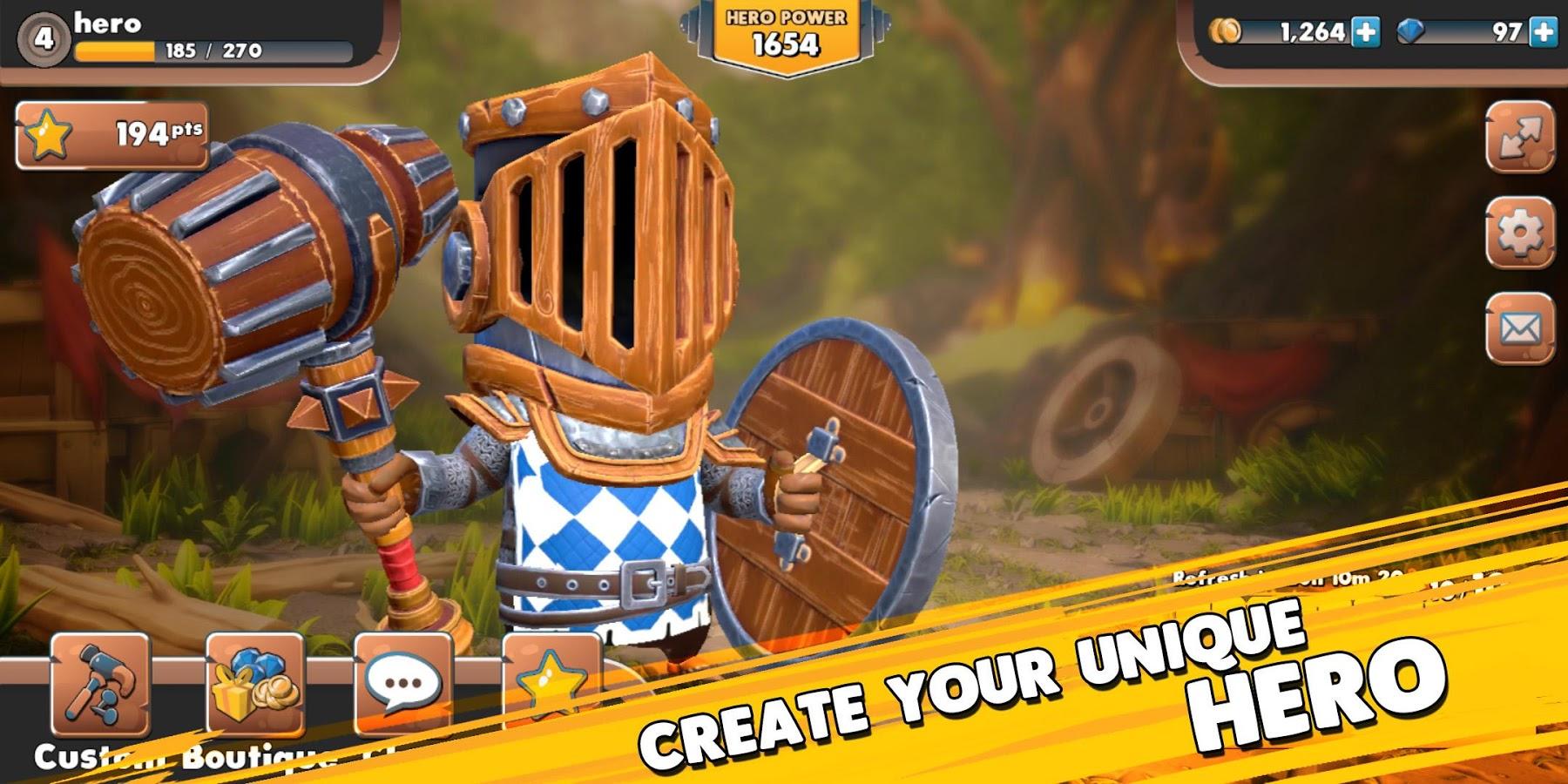 - Создание героя: настройте внешний вид, выберите оружие и щит, чтобы подготовиться к битве.
