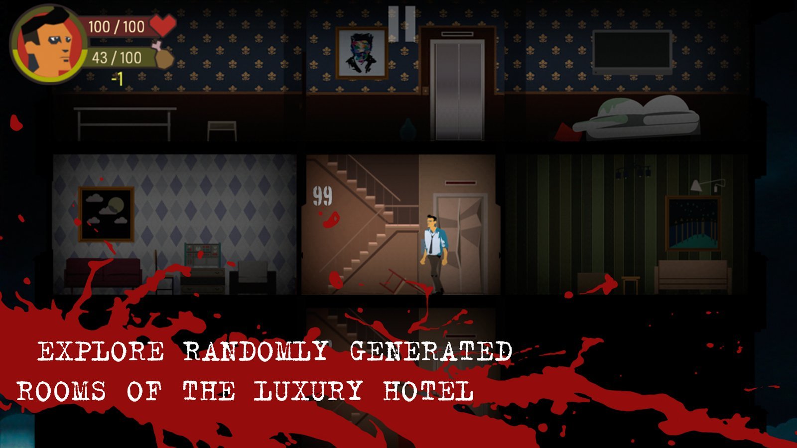 Каждый уровень отеля генерируется случайным образом, что делает каждую попытку уникальной. Вам предстоит исследовать комнаты в поисках еды, оружия и полезных предметов. Но будьте осторожны: за каждой дверью может скрываться мутант, готовый напасть. Решайте, стоит ли рисковать ради добычи или лучше сохранить силы.