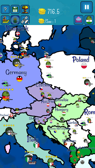 - Расширяйте влияние, завоёвывая новые страны и увеличивая свои ресурсы.