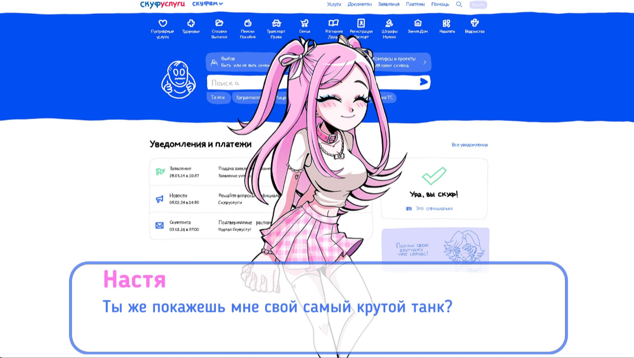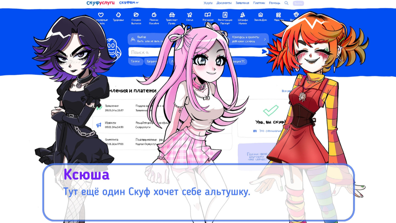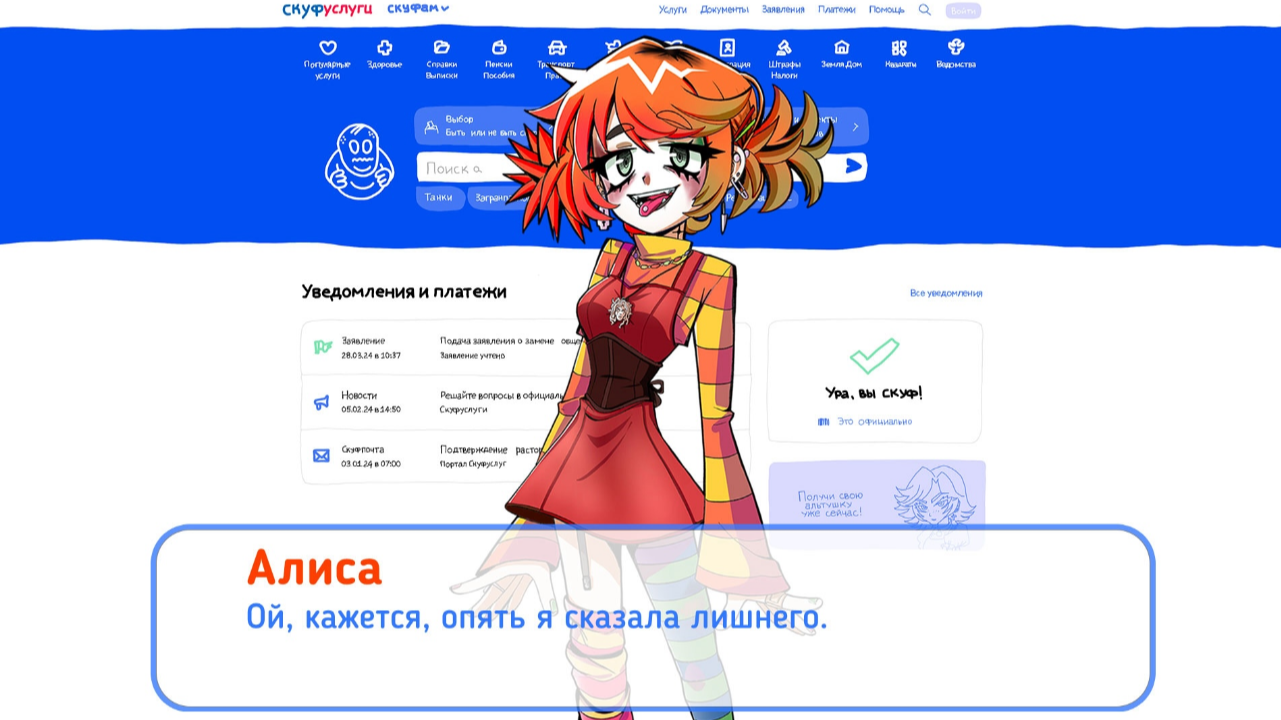"Альтушка для скуфа" — это визуальная новелла, вдохновлённая интернет-мемами. Вы погружаетесь в роль скуфа, который через "Скуфуслуги" пытается найти спутницу жизни. Вместо романтики вас ждёт ироничное путешествие по бюрократическому лабиринту, наполненное отсылками к мемам и культурным архетипам.