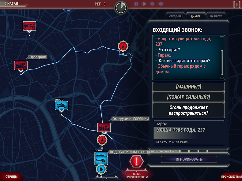 Перед началом смены вы распределяете экипажи по карте города, оснащаете их необходимым оборудованием и транспортом. В вашем распоряжении полицейские машины, скорые, пожарные автомобили и даже вертолеты. Каждое происшествие требует индивидуального подхода, и от правильного выбора зависит успех операции.