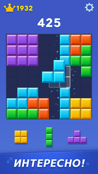 - Размещение блоков: перетаскивайте фигуры на поле, чтобы заполнять ряды и столбцы.
