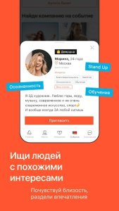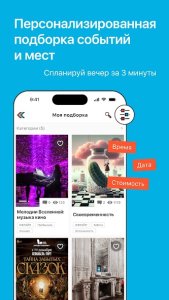Приложение предлагает подборки событий для всех случаев жизни. Среди них: техно-бранчи, иммерсивные спектакли, выставки современного искусства и даже закрытые вечеринки. Вы можете фильтровать мероприятия по интересам, чтобы быстро найти то, что подходит именно вам. А для тех, кто предпочитает домашний отдых, есть онлайн-ивенты: концерты, спектакли и образовательные трансляции.