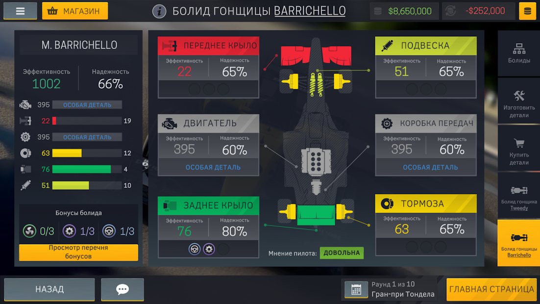 - Улучшаете болиды, выбирая оптимальные компоненты.