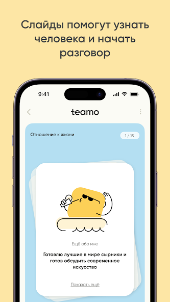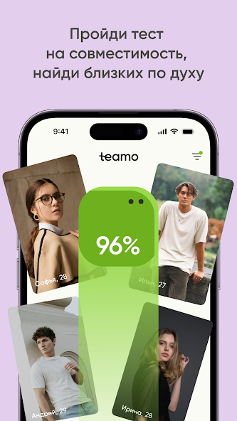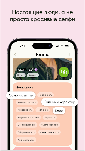 Теамо — это приложение для знакомств, которое помогает найти партнёра, основываясь на ваших интересах и характере. Здесь вы можете познакомиться с людьми для серьёзных отношений, лёгкого общения или просто новых знакомств. Уникальная система тестирования делает процесс поиска максимально точным и увлекательным.