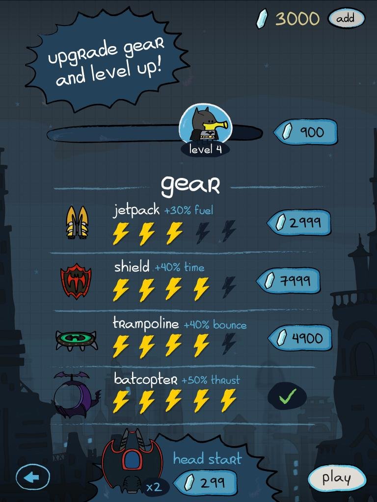 Игра предлагает множество костюмов для Бэтмена, включая Бэтмена будущего и даже Бэтмена-зебру. Эти наряды не только радуют глаз, но и добавляют разнообразия. Внутриигровая валюта позволяет улучшать бонусы, такие как джетпак или платформы с эффектами, что помогает вам подниматься ещё выше.