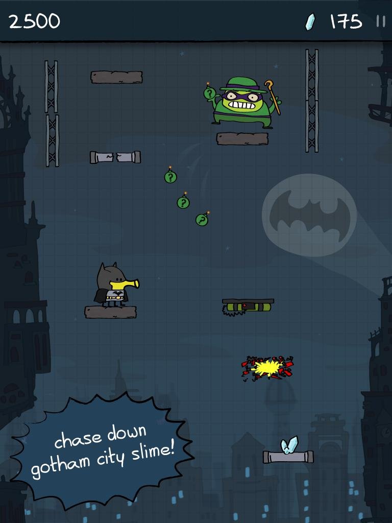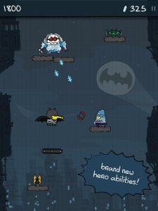 Doodle Jump DC Super Heroes — это аркадная игра, где вы берёте на себя роль Бэтмена, прыгающего по платформам в стиле классического Doodle Jump. Ваша цель — подниматься всё выше, избегая ловушек и сражаясь с известными злодеями из вселенной DC, такими как Джокер, Бэйн и Мистер Фриз. Атмосфера Готэма, бэт-сигнал в небе и мрачные улицы создают уникальный антураж.