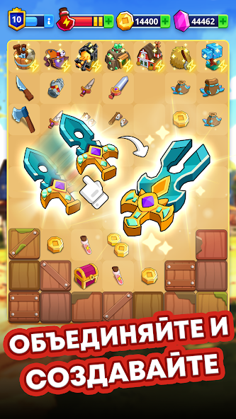 Основной механикой игры является объединение предметов. Вы создаёте инструменты и оружие, такие как мечи, топоры и молоты, чтобы преодолевать препятствия и сражаться с врагами. Каждое задание требует логики и стратегии: от расчистки зарослей до победы над драконами. Чем сложнее задача, тем более мощные предметы вам понадобятся.