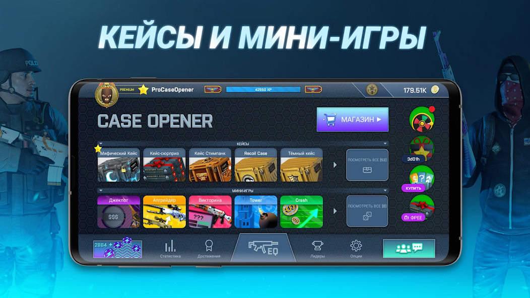 Case Opener предлагает не только открытие кейсов, но и множество мини-игр, которые добавляют разнообразие. Например: