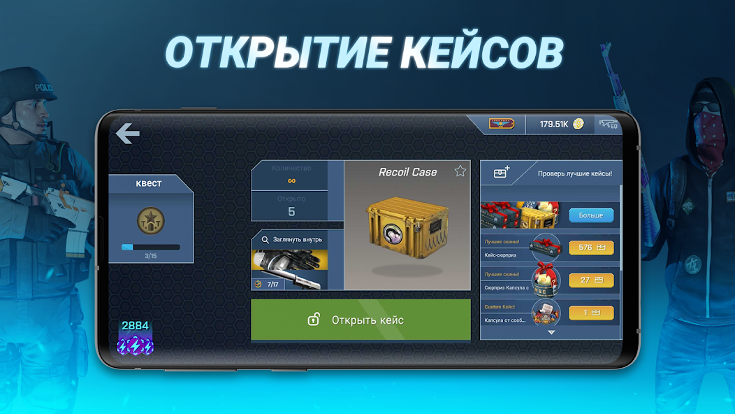 Вас ждет огромный выбор кейсов, включая сувенирные, а также возможность собирать уникальные коллекции скинов. Встроенная система контрактов позволяет объединять несколько скинов для получения более редких. Более 30 достижений и таблицы лидеров делают процесс еще более захватывающим, мотивируя вас становиться лучше.