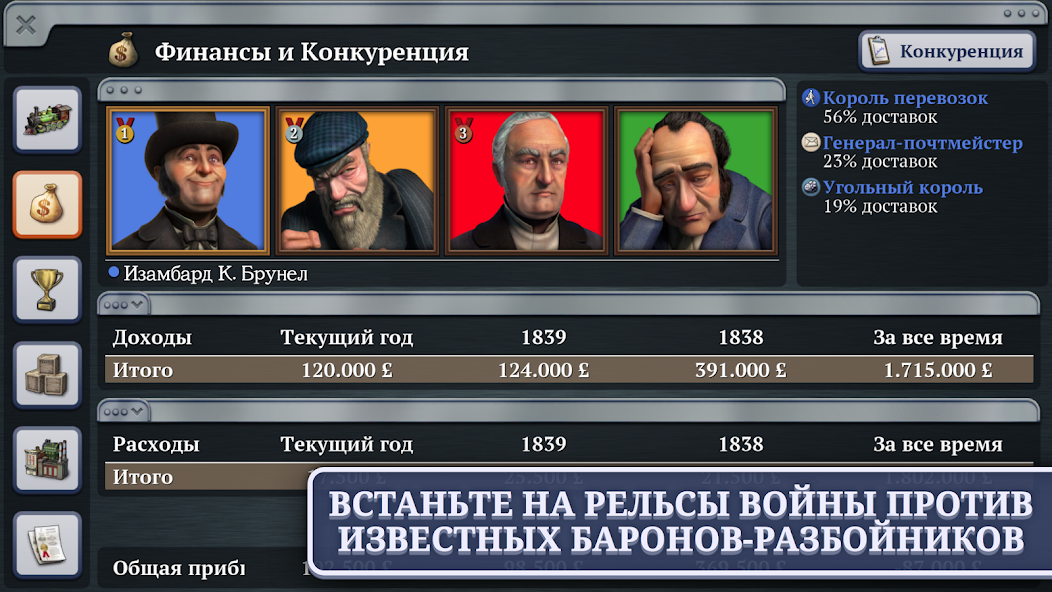 В Sid Meier's Railroads! вы не только прокладываете маршруты, но и управляете бизнесом. Покупайте патенты, торгуйте акциями и инвестируйте в индустрии, чтобы увеличить прибыль. Также вы можете использовать легендарные локомотивы, такие как "Planet" Стефенсона или французский TGV, чтобы сделать свою сеть более эффективной.